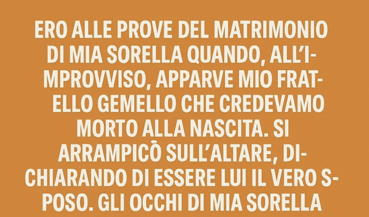 Ero alle prove del matrimonio di mia sorella quando, all’improvviso, apparve mio fratello gemello, che tutti avevamo creduto morto alla nascita. Salì sull’altare e dichiarò di essere lui il vero sposo.