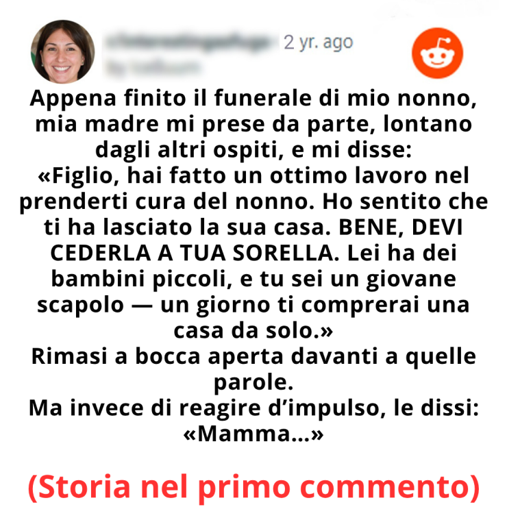 «Figlio, hai fatto un ottimo lavoro nel prenderti cura del nonno. Ho saputo che ti ha lasciato la sua casa. BENE, DEVI CEDERLA A TUA SORELLA. Lei ha dei bambini piccoli e tu sei un giovane scapolo — prima o poi ti comprerai una casa tutta tua.»