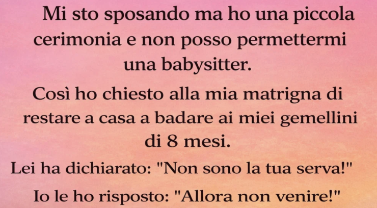 Avevo deciso di fare un matrimonio intimo. Il budget era stretto, e non potevo permettermi una babysitter per i miei gemellini di otto mesi. Così chiesi alla mia matrigna di restare a casa e occuparsene. Lei reagì male:
