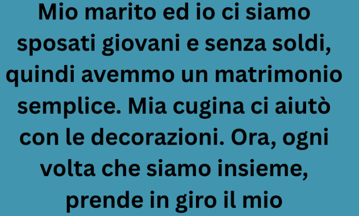 Mio marito ed io ci siamo sposati giovani e senza soldi, quindi avemmo un matrimonio semplice. Mia cugina mi aiutò con le decorazioni. Ora, ogni volta che siamo insieme, prende in giro il mio matrimonio. Oggi, durante una riunione di famiglia, ha ricominciato. E io, finalmente, ho perso la pazienza e ho detto: “Almeno il nostro matrimonio è stato costruito sull’amore, non sui like di Instagram.”
