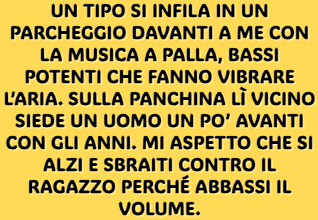 Un tipo si infila in un parcheggio davanti a me con la musica a palla, bassi potenti che fanno vibrare l’aria. Sulla panchina lì vicino siede un uomo un po’ avanti con gli anni. Mi aspetto che si alzi e sbraiti contro il ragazzo perché abbassi il volume.
