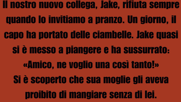 Il nostro nuovo collega, Jake, rifiutava sempre quando lo invitavamo a pranzo. Un giorno, il capo portò delle ciambelle. Jake quasi si mise a piangere e sussurrò: