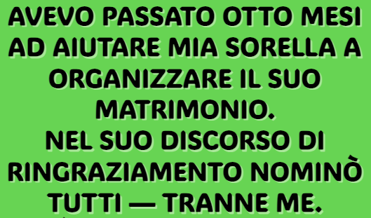 Avevo passato otto mesi ad aiutare mia sorella a organizzare il suo matrimonio. Nel suo discorso di ringraziamento nominò tutti — tranne me.