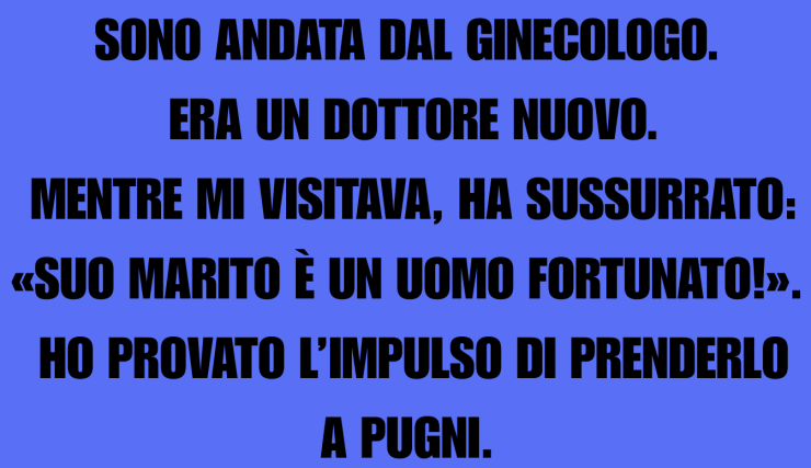 Ero andata dal ginecologo. Era un dottore nuovo. Durante la visita, sussurrò: «Suo marito è un uomo fortunato!». In quel momento avrei voluto prenderlo a pugni.