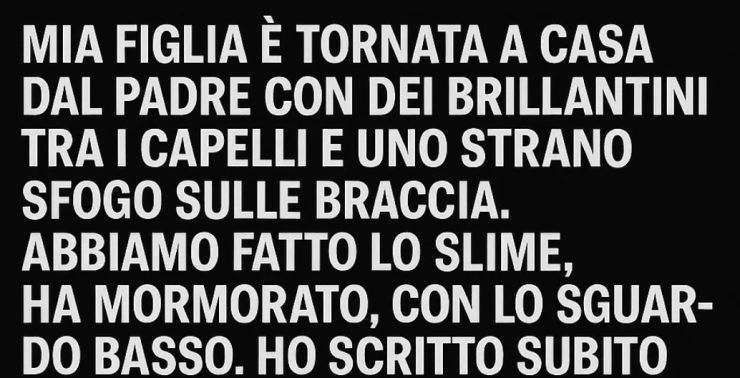 Mia figlia è tornata a casa dal padre con dei brillantini tra i capelli e uno strano sfogo sulle braccia. «Abbiamo fatto lo slime», ha mormorato, lo sguardo fisso a terra. Ho scritto subito al mio ex, furiosa, ma lui ha giurato di essere stato fuori tutto il giorno.