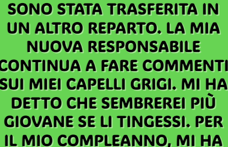 Sono stata trasferita in un altro reparto. La mia nuova responsabile continua a fare commenti sui miei capelli grigi. Mi ha detto che sembrerei più giovane se li tingessi. Per il mio compleanno, mi ha regalato una gift card per un salone di bellezza. L’ho cortesemente restituita. Il giorno dopo, le Risorse Umane mi hanno chiesto di parlare in privato.
