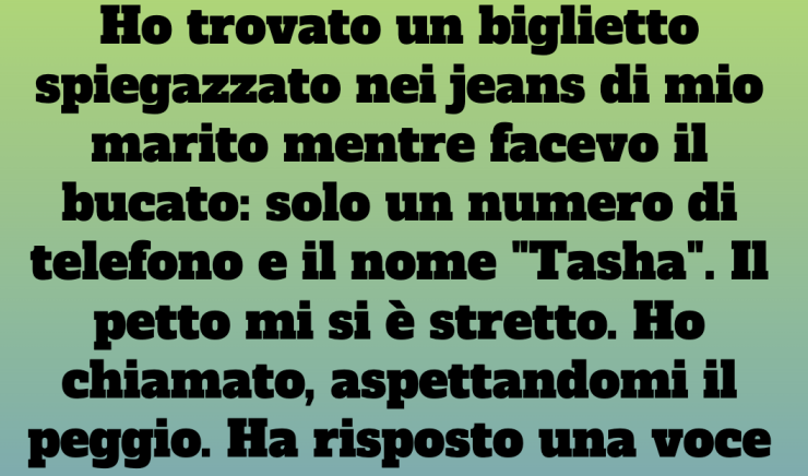 Ho trovato un biglietto spiegazzato nei jeans di mio marito mentre facevo il bucato: solo un numero di telefono e il nome “Tasha”. Il petto mi si è stretto. Ho chiamato, aspettandomi il peggio. Ha risposto una voce di bambina, allegra e spensierata. Quando ho chiesto di Tasha, lei ha urlato: “Mamma! La signora del telefono di papà ti cerca!”. Poi la linea è caduta nel silenzio.