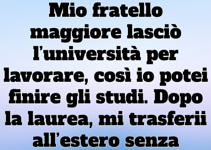 Mio fratello maggiore lasciò l’università per lavorare, così io potei finire gli studi. Dopo la laurea, mi trasferii all’estero senza dirglielo. Scrissi solo un messaggio: “Ho bisogno di spazio.” Lui rispose: “Capisco.” Era due anni fa.