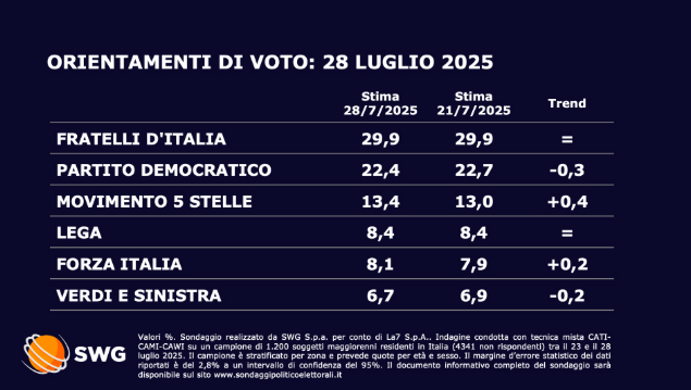 Il sondaggio evidenzia una stabilità per Fratelli d’Italia, il partito di Giorgia Meloni, che si mantiene al 29,9%. La solidità del governo è un tema centrale, con la Lega di Matteo Salvini che si attesta all’8,4% e Forza Italia, in crescita dello 0,2%, che raggiunge l’8,1%. Questi dati suggeriscono un momento favorevole per la coalizione di governo, mentre il Pd continua a mostrare segni di debolezza.