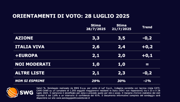 Inoltre, la segretaria del Pd è percepita come ostaggio della situazione politica, in particolare del leader del Movimento Cinque Stelle, Giuseppe Conte, che sta tenendo il partito a “bagnomaria” riguardo a possibili alleanze nelle Marche. Il Movimento Cinque Stelle, dal canto suo, guadagna terreno, segnando un incremento dello 0,4% e attestandosi al 13,4%. Nel contesto della sinistra, Alleanza Verdi e Sinistra, guidata da Angelo Bonelli e Nicola Fratoianni, subisce una leggera flessione, scendendo dello 0,2% al 6,7%. Anche Azione perde lo 0,2%, portandosi al 3,3%, mentre Italia Viva di Matteo Renzi guadagna lo 0,2%.