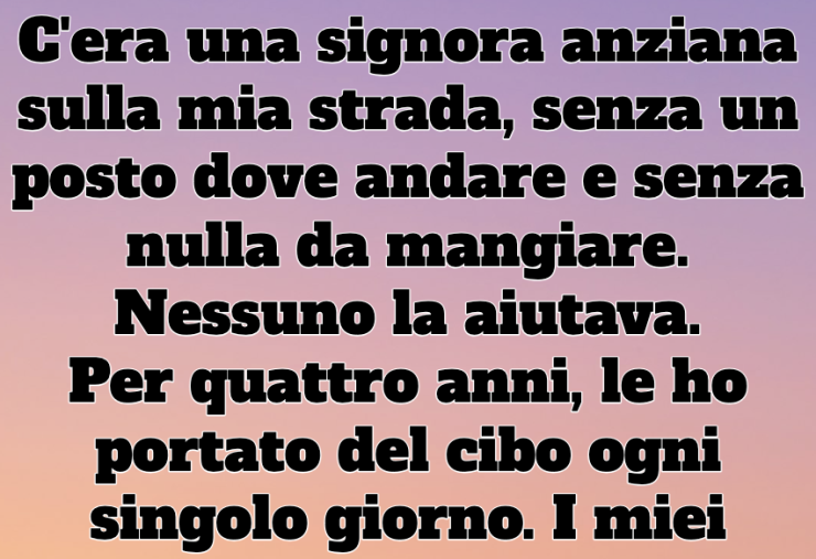 Non conoscevo la sua storia, ma potevo percepire l’assenza nella sua vita. Un giorno, le portai un piatto di avanzi. Solo un pasto semplice, niente di speciale. Annuì ringraziando, ma disse pochissimo.