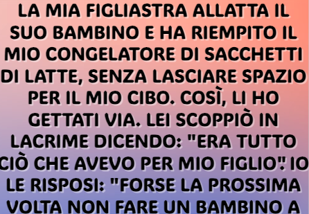 Mia figliastra allattava e aveva riempito il mio congelatore di sacchetti di latte materno, senza lasciare spazio al mio cibo. Così li gettai via. Lei pianse dicendo: “Era tutto ciò che aveva la mia bambina”. Io ribattei: “Forse la prossima volta non fare un figlio a diciassette anni!”. Suo padre, Ben, ammutolì. Pensai fosse solo arrabbiato.