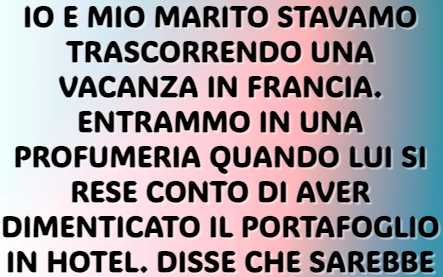 Io e mio marito stavamo trascorrendo una vacanza in Francia. Entrammo in una profumeria quando lui si rese conto di aver dimenticato il portafoglio in hotel. Disse che sarebbe tornato subito. Passò mezz’ora, ma di lui nessuna traccia. Dopo un’ora, ero ormai sull’orlo di una crisi. Fu allora che un addetto alla sicurezza si avvicinò e mi chiese di seguirlo.