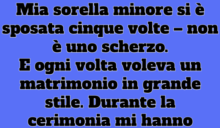 Mia sorella minore si è sposata cinque volte – non è uno scherzo. E ogni volta voleva un matrimonio vero e proprio. Durante la cerimonia mi hanno passato il microfono per il brindisi. Ho usato lo stesso discorso che avevo fatto ai quattro matrimoni precedenti. Solo che non mi sono accorta che lo sposo lo aveva già sentito.