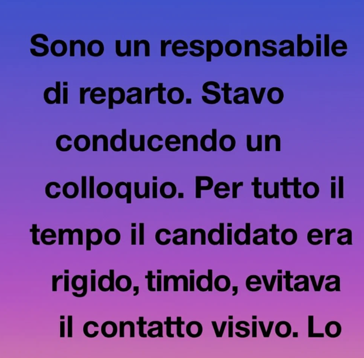 Sono un responsabile di reparto. Stavo conducendo un’intervista. Per tutto il tempo, il candidato era rigido, timido, evitando il contatto visivo. Lo accompagno fuori, pensando: Che debole da farsi! Non lo assumo. Torno nel mio ufficio e improvvisamente scorgo il suo curriculum, che avevo buttato via prima durante il colloquio. Qualcosa attira la mia attenzione: volontariato con bambini rifugiati, borse di studio per un bootcamp di programmazione, conoscenza fluente di tre lingue. Alzo le sopracciglia. Aspettare… che cosa?