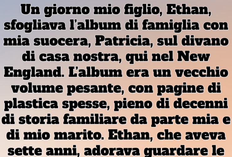 Un giorno mio figlio, Ethan, sfogliava l’album di famiglia con mia suocera, Patricia, sul divano di casa nostra, qui nel New England. L’album era un vecchio volume pesante, con pagine di plastica spesse, pieno di decenni di storia familiare da parte mia e di mio marito. Ethan, che aveva sette anni, adorava guardare le vecchie foto: chiedeva sempre di identificare i cugini lontani o i capelli strani di ogni immagine. Patricia, la madre di mio marito David, accontentava la sua curiosità con la sua solita dolce pazienza, raccontando piccole e tenere aneddoti su ognuno.