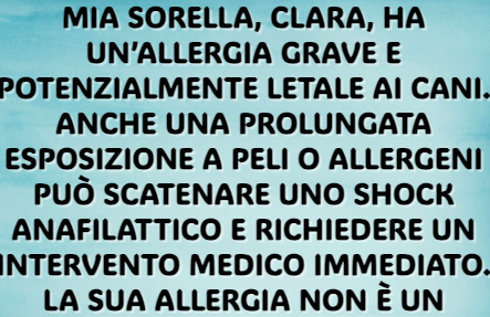 Mia sorella, Clara, ha un’allergia grave e potenzialmente letale ai cani. Anche una prolungata esposizione a peli o allergeni può scatenare uno shock anafilattico e richiedere un intervento medico immediato. La sua allergia non è un problema da poco: ha condizionato innumerevoli riunioni e festività nel corso degli anni. Viviamo in un mondo dove pianificare attorno alla sua salute non è un’opzione, è una necessità permanente.