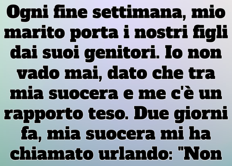 Ogni fine settimana, mio marito porta i nostri figli dai suoi genitori. Io non mi unisco mai, poiché tra me e mia suocera c’è un rapporto teso. Due giorni fa, mia suocera mi ha chiamata urlando: “Non vediamo i bambini da quattro mesi, tu non gli permetti di venire a trovarci!”.