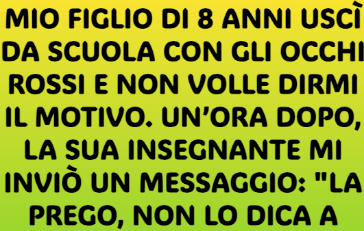 Mio figlio di otto anni uscì da scuola con gli occhi rossi e si rifiutò di dirmi il perché. Un’ora dopo, l’insegnante mi inviò un messaggio: «Per favore, NON lo dica a suo figlio, dobbiamo vederci». Mi si gelò lo stomaco. Quando arrivai, mi mostrò il telefono. Sullo schermo c’era una foto sfocata scattata da dietro la palestra della scuola: mio figlio, accovacciato da solo, con le ginocchia strette al petto.