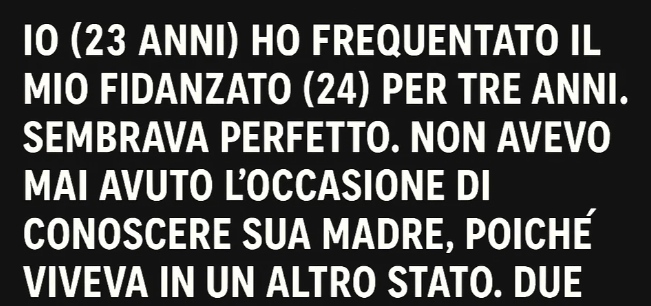 Il giorno seguente, mentre lui era uscito a fare la spesa, mi sedetti con sua madre. Non girai troppo intorno alla questione: «Cosa cercava di dirmi ieri?» le chiesi. Il suo volto cambiò espressione. Distolse lo sguardo, come se stesse per tradire suo figlio. «Non dovrei…» mormorò. «Ma stai per sposarlo, e meriti di sapere la verità.»