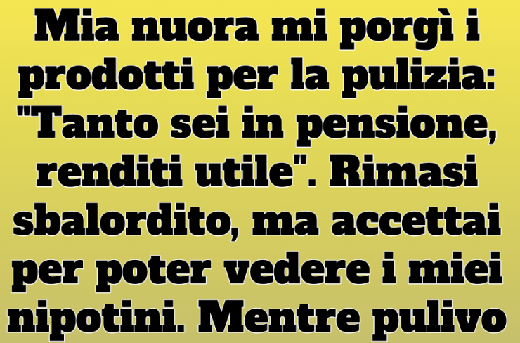 Mia nuora mi porse i prodotti per la pulizia dicendo: “Tanto sei in pensione, renditi utile”. Rimasi sbalordito, ma accettai per poter vedere i miei nipotini. Mentre pulivo il suo bagno, trovai qualcosa nascosto dietro il water che spiegava perché mio figlio sembrasse così distrutto. Era una piccola busta. Non polverosa, come se fosse stata lì per anni, ma fresca. Nascosta di recente.