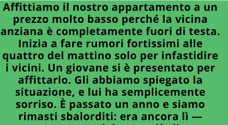 Affittiamo il nostro appartamento a un prezzo basso perché la vecchia signora del piano di sopra era fuori di testa. Ogni mattina, alle quattro in punto, iniziava a fare un baccano insopportabile: sbatteva le ante, trascinava il bastone lungo le pareti del corridoio e marciava sul posto come se si stesse allenando per una parata. Poi, all’improvviso, rideva da sola, come se stesse assistendo a uno spettacolo comico che capiva solo lei.