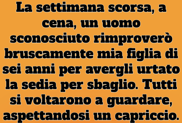 La settimana scorsa, a cena, un uomo sconosciuto rimproverò bruscamente mia figlia di sei anni per avergli urtato la sedia per sbaglio. Tutti si voltarono a guardare, aspettandosi un capriccio. Ma mia figlia finì tranquillamente il suo pasto, si alzò, si avvicinò al tavolo dell’uomo e gli sussurrò: