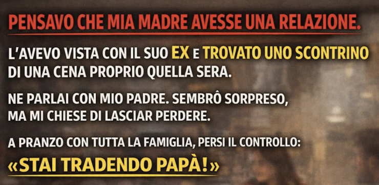 Pensavo che mia madre avesse una relazione. L’avevo vista con il suo ex e trovato uno scontrino di una cena proprio quella sera. Ne parlai con mio padre. Sembrò sorpreso, ma mi chiese di lasciar perdere. A pranzo con tutta la famiglia, persi il controllo: «Stai tradendo papà!» Lei si alzò in piedi e, sbattendo i palmi sul tavolo, fece volare via un bicchiere di cristallo. «Non sto tradendo nessuno,» dichiarò, «ma ho mentito. E ho finito di farlo.»