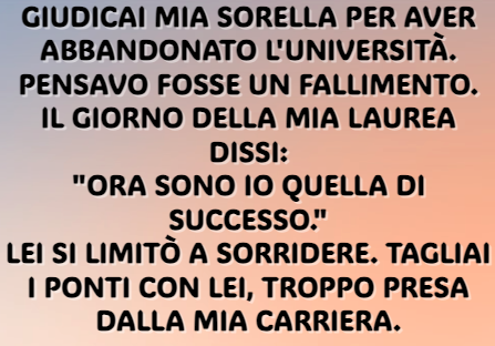Per me rappresentava un fallimento monumentale, un segno che le mancava la determinazione necessaria per la vita reale. Smettere così facilmente era la prova, ai miei occhi, che non prendesse sul serio il proprio futuro. Ricordo di aver detto ai nostri genitori che stava sprecando il suo potenziale, convinta che sarebbe finita alla deriva per sempre. Mi era difficile rispettare qualcuno che non inseguiva un successo convenzionale e quantificabile.