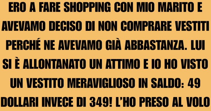 Ero a fare shopping con mio marito, e avevamo deciso di non comprare nessun vestito, perché ne avevamo già abbastanza. Lui si è girato un attimo e io ho visto un abito meraviglioso in saldo: 49 dollari invece di 349! L’ho afferrato al volo e ho detto all’assistente del negozio: “Per favore, non dica il prezzo ad alta voce!”. Ma non appena ha visto mio marito, ha praticamente gridato: “Che affare! 49 dollari invece di 349… incredibile, vero?!”.