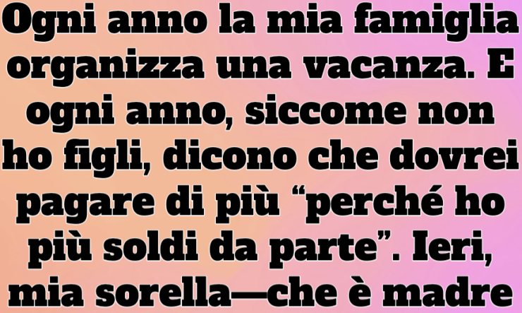 Ogni anno la mia famiglia organizza una vacanza. E ogni anno, siccome non ho figli, dicono che dovrei pagare di più “perché ho più soldi da parte”. Ieri, mia sorella—che è madre single—mi ha chiesto di coprire la quota di sua figlia. Ero stanca. Così ho detto che non sarei andata. Lei ha risposto: “Allora non tieni più alla famiglia.”