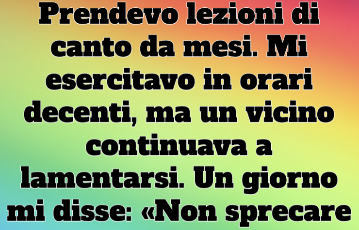 Prendevo lezioni di canto da mesi. Mi esercitavo in orari decenti, ma un vicino continuava a lamentarsi. Un giorno mi disse: «Non sprecare il tuo tempo e la mia pazienza. Basta.» Ma io continuai. Più tardi, rimasi scioccata quando sua moglie si presentò alla mia porta in lacrime.