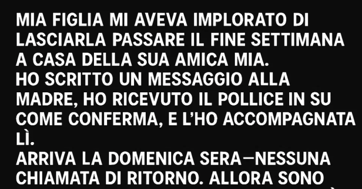 Mia figlia mi aveva supplicata di lasciarla trascorrere il fine settimana dalla sua amica Mia. Ho scritto un messaggio alla madre, ho ricevuto un pollice in su come risposta e l’ho accompagnata.