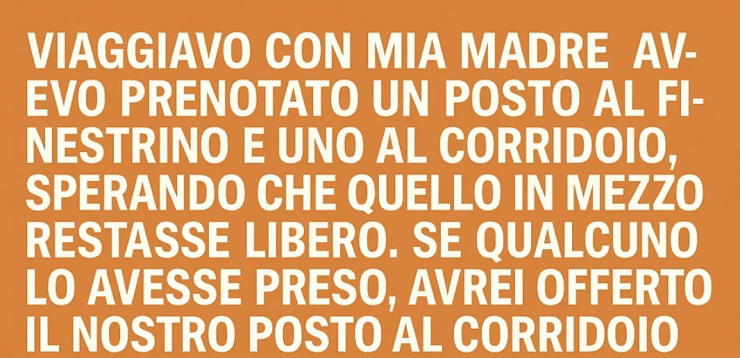 Viaggiavo con mia madre e avevo prenotato il posto finestrino e il corridoio, sperando che quello centrale rimanesse libero. Se qualcuno lo avesse occupato, avrei offerto il mio posto o quello di mia madre. Saliamo a bordo. Una donna è già seduta nel mio posto al corridoio. AirPods nelle orecchie, occhi chiusi. Va bene – mi siedo nel mezzo. Dopo cinque minuti, arriva un uomo. La donna si irrigidisce quando lui dice, secco: «Credo che quello sia il mio posto».