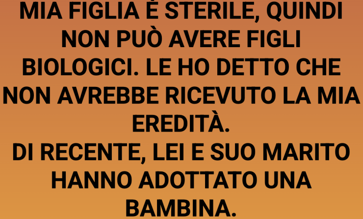 Mia figlia è sterile, quindi non può avere figli biologici. Le avevo detto che non avrebbe ricevuto la mia eredità. Di recente, lei e suo marito hanno adottato una bambina. Mia figlia mi ha chiesto se questo contasse. Ho risposto di no.
