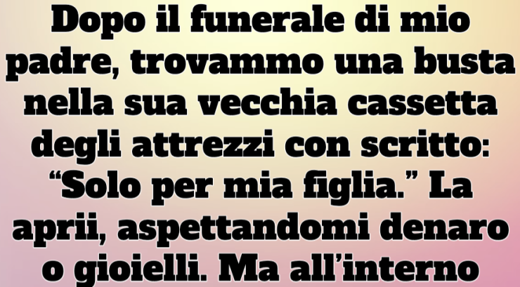 Dopo il funerale di mio padre, trovammo una busta nella sua vecchia cassetta degli attrezzi con scritto: “Solo per mia figlia.” La aprii, aspettandomi denaro o gioielli. Ma all’interno c’era solo un foglio di carta con scritto: “Non fidarti mai di tua madre! Lei ha sempre nascosto—” e il resto della frase era illeggibile, forse rovinato dall’acqua, dal tempo… o forse dalle lacrime.