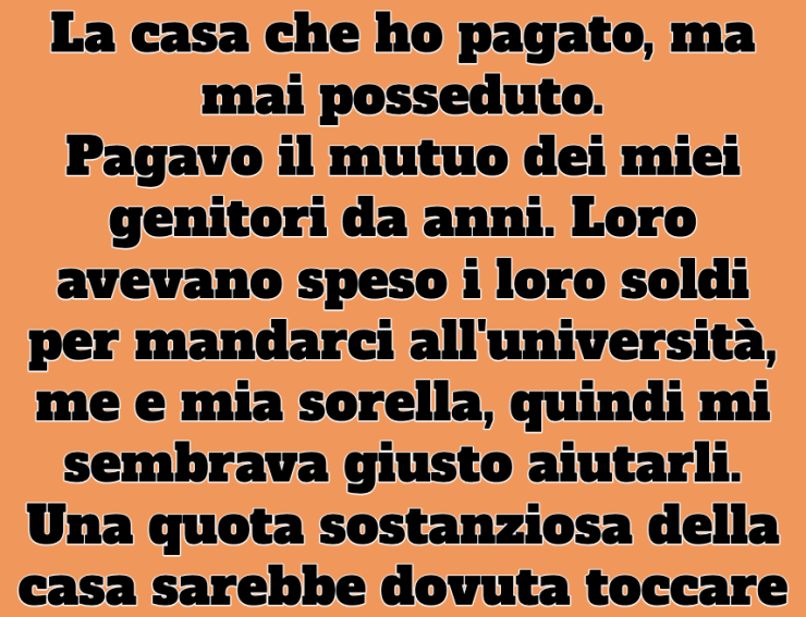 Pagavo il mutuo dei miei genitori da anni. Loro avevano speso i loro soldi per mandarci all’università, me e mia sorella, quindi mi sembrava giusto aiutarli. Una quota sostanziosa della casa sarebbe dovuta toccare a me, alla vendita. Ora, mia sorella disoccupata si è trasferita lì e i miei dicono che ha bisogno di «un nuovo inizio» e «il suo nome sull’atto».