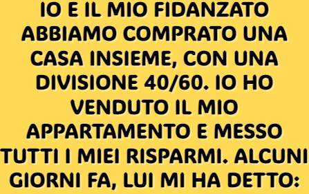 Io e il mio fidanzato abbiamo comprato una casa insieme, con una divisione 40/60. Io ho venduto il mio appartamento e messo tutti i miei risparmi. Alcuni giorni fa, lui mi ha detto: