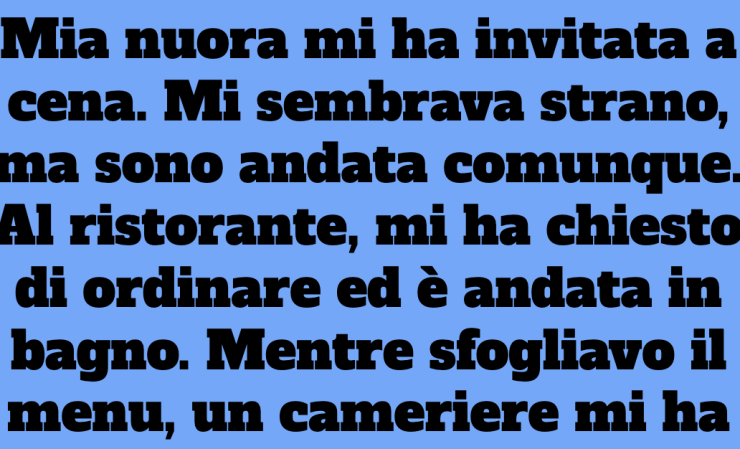 Mia nuora mi ha invitata a cena. Mi sembrava strano, ma sono andata comunque. Al ristorante, mi ha chiesto di ordinare ed è andata in bagno. Mentre sfogliavo il menu, un cameriere mi ha improvvisamente afferrato il braccio e sussurrato: “Stia attenta! Sua nuora non vuole che lei sappia che…”