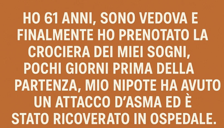Ho 61 anni, sono vedova e finalmente ho prenotato la crociera dei miei sogni. Pochi giorni prima della partenza, mio nipote ha avuto un attacco d’asma ed è finito in ospedale. Mia figlia mi ha chiesto di cancellare il viaggio e aiutarla con gli altri bambini. Ho detto di no.