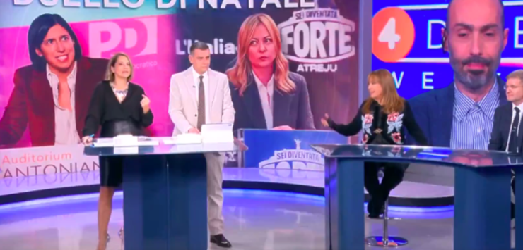 Alle ore 16:00, il programma di approfondimento politico trasmesso su Rete 4 ha affrontato il confronto a distanza tra la Presidente del Consiglio Giorgia Meloni e la Segretaria del Partito Democratico Elly Schlein. La Presidente Meloni ha concluso il suo intervento ad Atreju con una lunga esposizione dei risultati ottenuti dal suo governo, accompagnata da alcune critiche rivolte alla sinistra. La Segretaria Schlein, d’altro canto, si è concentrata principalmente sulla gestione interna del suo partito.