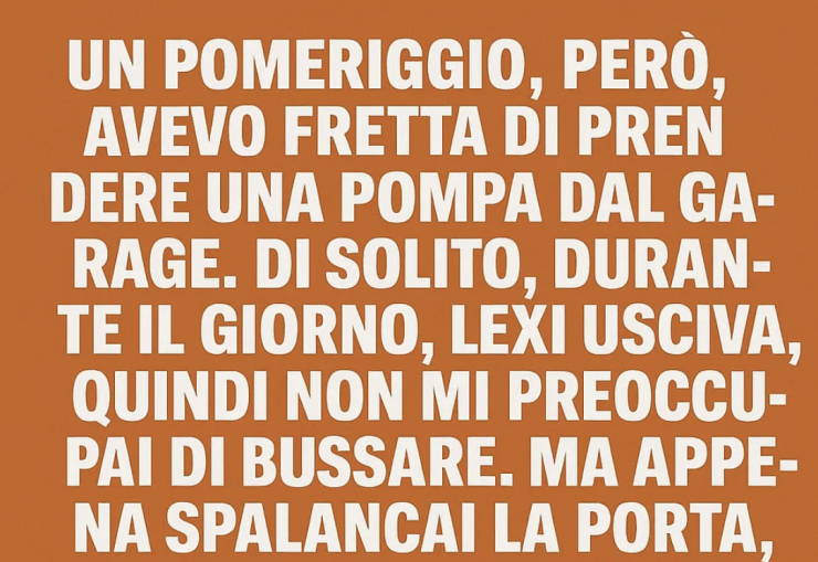 Un pomeriggio, però, avevo fretta di recuperare una pompa dal garage. Di solito Lexi usciva durante il giorno e non mi preoccupai di bussare. Aprii la porta all’improvviso… e rimasi senza parole.