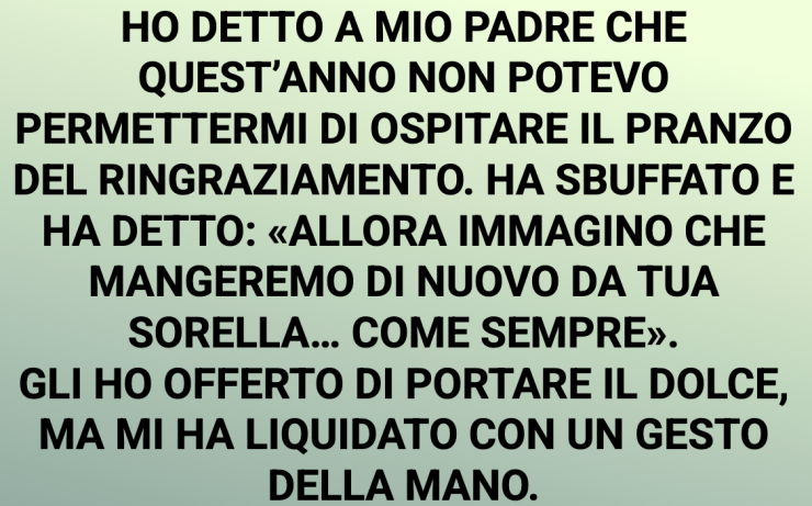 Ho detto a mio padre che quest’anno non potevo permettermi di ospitare il pranzo del Ringraziamento. Ha sbuffato e ha detto: «Allora immagino che mangeremo di nuovo da tua sorella… come sempre».