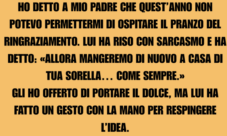 Dissi a mio padre che quell’anno non potevo permettermi di ospitare il pranzo del Ringraziamento. Lui rise sarcasticamente e disse: «Allora mangeremo di nuovo da tua sorella… come sempre.»