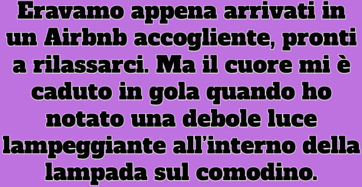 Eravamo appena arrivati in un Airbnb accogliente, pronti a rilassarci. Ma il cuore mi è caduto in gola quando ho notato una debole luce lampeggiante all’interno della lampada sul comodino. Pensando fosse una telecamera nascosta, l’ho subito staccata dalla presa. Pochi secondi dopo, il proprietario è piombato dentro gridando: “Siete impazziti?” È stato un miracolo che non abbia lanciato la lampada fuori dalla finestra.