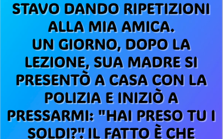 Stavo dando ripetizioni alla mia amica. Un giorno, dopo la lezione, sua madre si presentò a casa con la polizia e iniziò a pressarmi: “Hai preso tu i soldi?”. Il fatto è che nell’appartamento era scomparsa una notevole somma in contanti. Ma io non avevo preso nulla; non ero nemmeno entrata in quella stanza! Tuttavia, il modo in cui sua madre mi guardava – come se avesse già deciso che fossi colpevole – mi fece annodare lo stomaco.