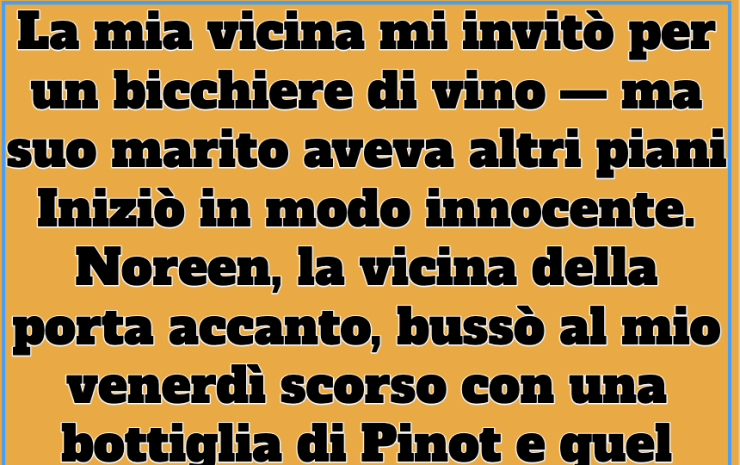 Iniziò in modo innocente. Noreen, la vicina della porta accanto, bussò al mio venerdì scorso con una bottiglia di Pinot e quel sorriso brillante e nervoso che fa sempre quando c’è qualcosa che non va. Avevo intenzione di sistemare il garage, ma pensai — perché no? Non passavo una serata tra ragazze da mesi.