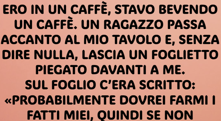 Ero in un caffè, stavo bevendo un caffè. Un ragazzo passa accanto al mio tavolo e, senza dire una parola, lascia un foglietto piegato davanti a me.