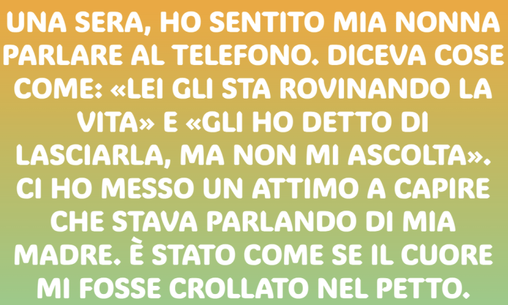Una sera, ho sentito mia nonna parlare al telefono. Diceva cose come: «Lei gli sta rovinando la vita» e «Gli ho detto di lasciarla, ma non mi ascolta». Ci ho messo un attimo a capire che stava parlando di mia madre. È stato come se il cuore mi fosse caduto nel petto.