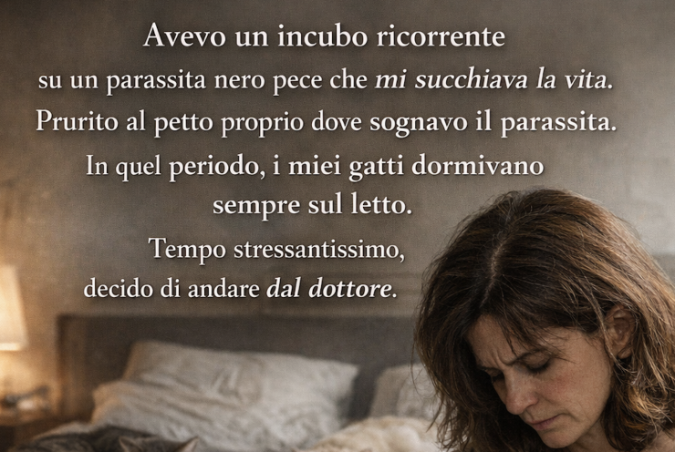 Incubo ricorrente parassita nero pece succhia vita. Prurito petto esattamente dove sognavo parassita. Periodo gatti dormivano sempre letto mio. Stress estremo, decido dottore.